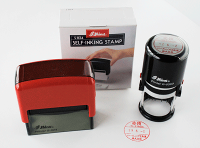 シャイニーはスタンプ台内蔵式の回転自動印です。内蔵式なのでスタンプ台不要で捺印できます。矩形のものから日付の帯の付いたデータ印もあります。